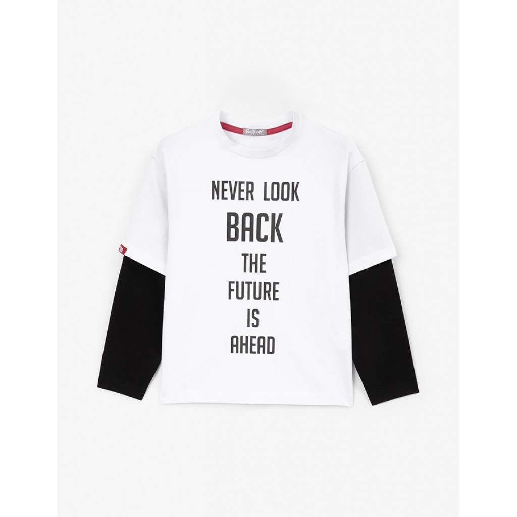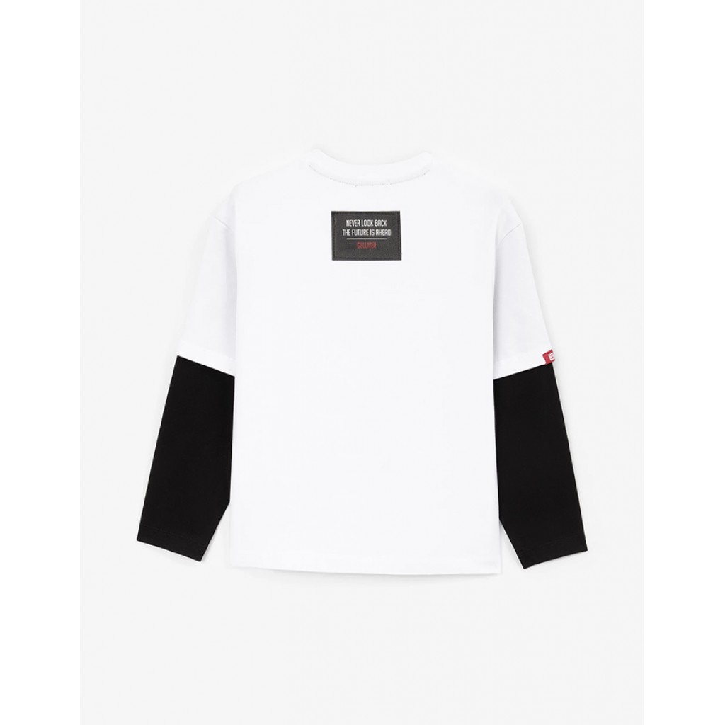 Белый лонгслив прямой свободной формы – стильная базовая вещь в осенне-зимнем гардеробе мальчика. Лонгслив выполнен из мягкого хлопкового полотна с эластаном, очень приятного при тактильном контакте. Дизайн модели построен на имитации многослойности. Контрастные рукава, крупный шрифтовой принт на передней части и минималистичная кожаная нашивка на спинке придают лонгсливу дерзость и непринужденность стритстайла - главного тренда современной моды.