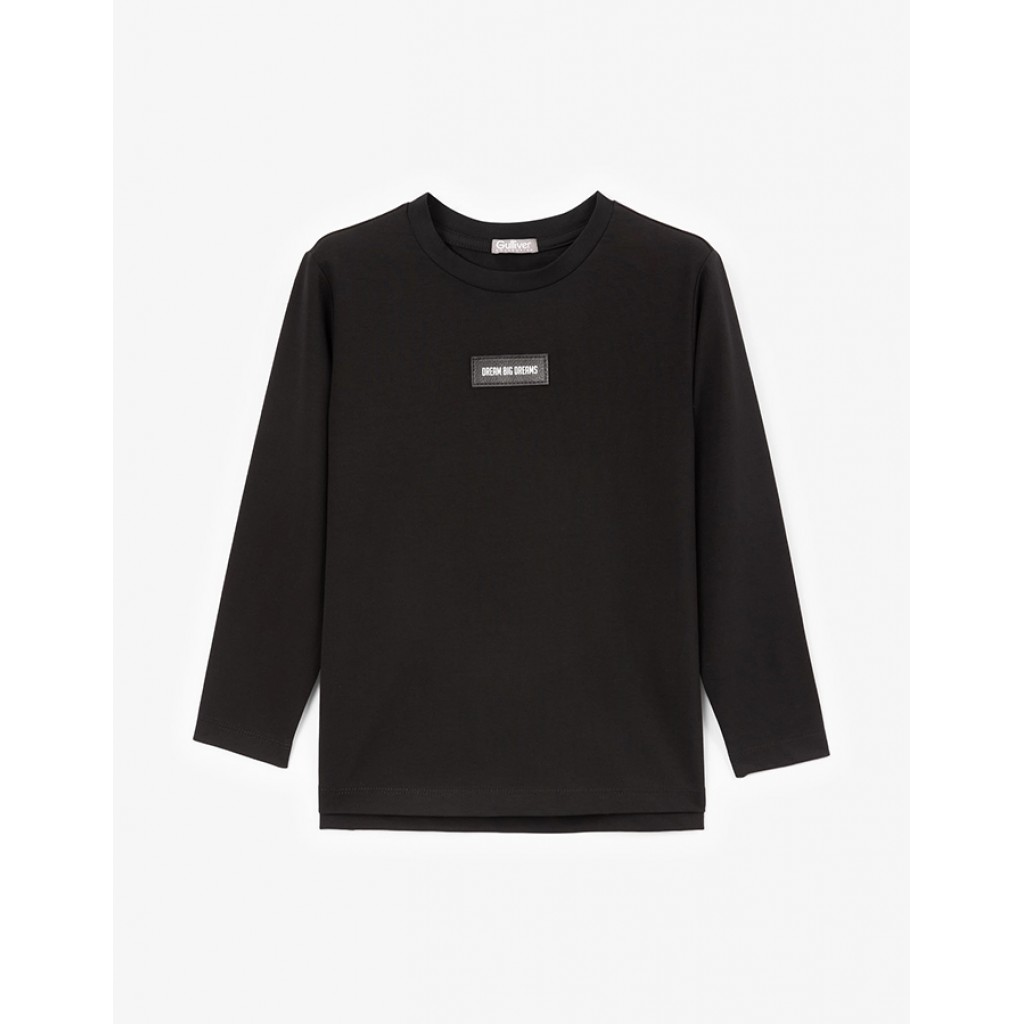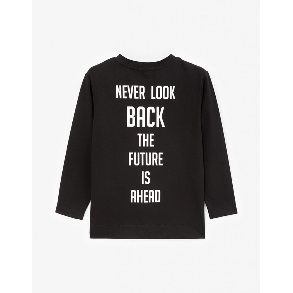Черный лонгслив прямой свободной формы со спущенной линией плеч – стильная универсальная базовая вещь в осенне-зимнем гардеробе мальчика. Лонгслив с заниженной линией спинки выполнен из мягкого хлопкового полотна с эластаном, очень приятного при тактильном контакте. Дизайн модели построен на крупном шрифтовом принте на спинке и минималистичной кожаной нашивке на передней части лонгслива.
