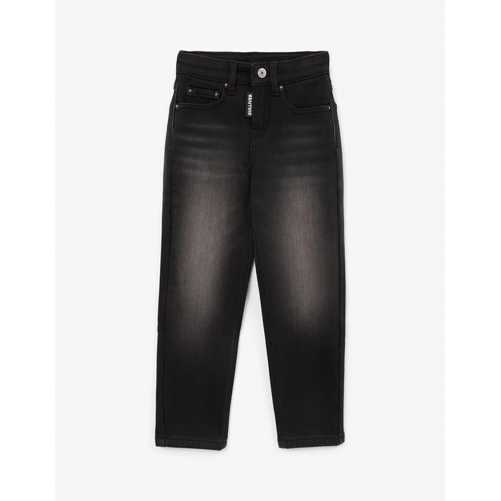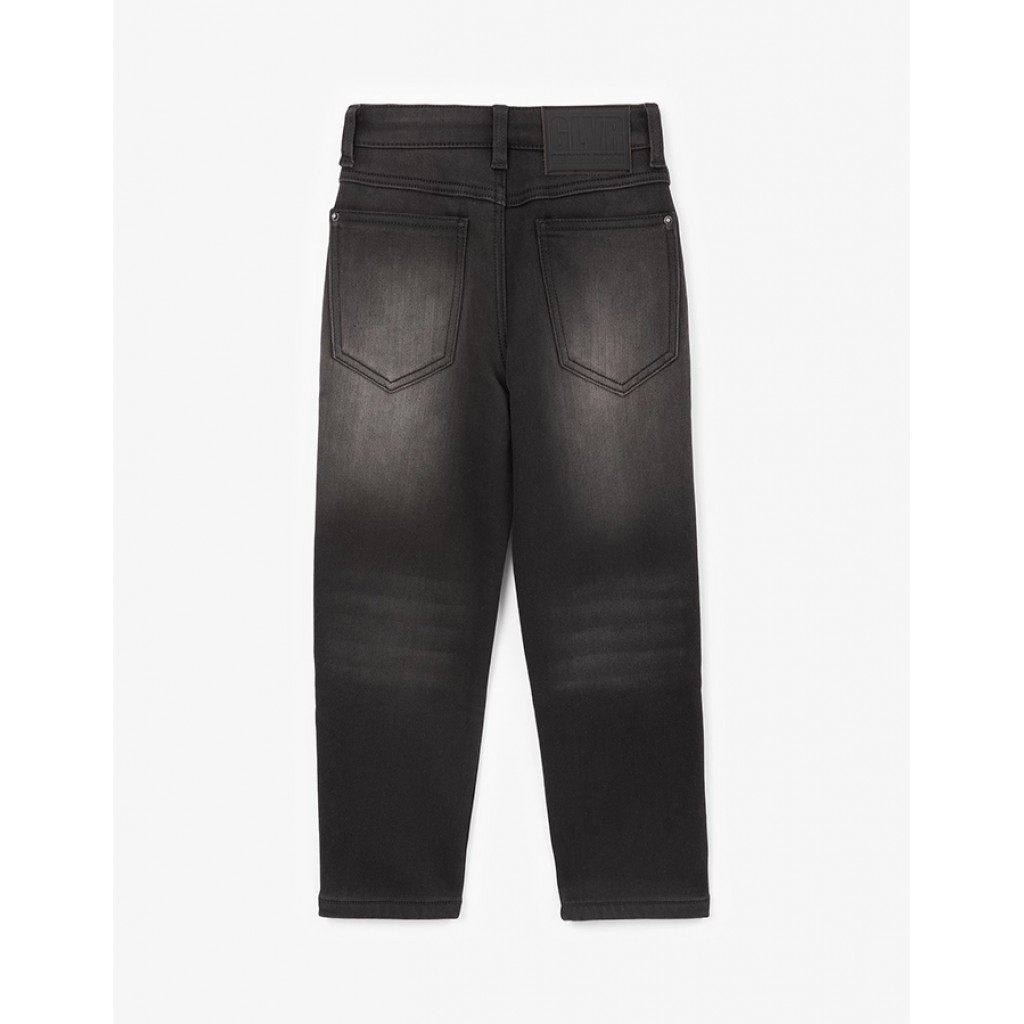 Прямые утепленные черные джинсы - основа осенне-зимнего прогулочного гардероба. Мягкие, уютные, джинсы на флисе позволят мальчику чувствовать себя комфортно в самые холодные и ненастные дни. Модная варка и потертости придают джинсам стильный современный вид. Эластан в составе денима делает джинсы пластичными и удобными, не препятствующими свободе движений мальчика. В оформлении модели использованы флажок на гульфике и крупная кожаная нашивка на поясе с объемными шрифтовыми элементами. Джинсы застегиваются на молнию и крючок.