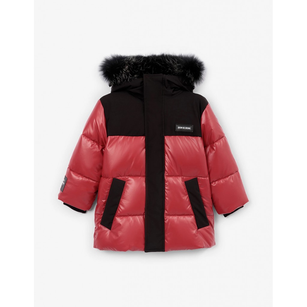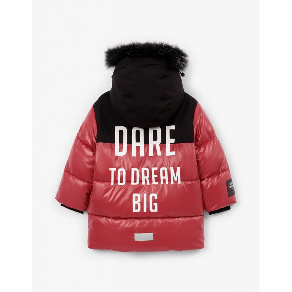 Зимнее стеганое полупальто на искусственном пуху - олицетворение комфорта и защищенности в морозный день. Плотная красная глянцевая плащовка, способная выдержать любые зимние испытания, гармонично сочетается с контрастным черным матовым плащевым материалом отделки. Глубокий капюшон с отстегивающимся натуральным мехом енота, вместительные карманы-листочки, застежка на тракторную молнию с защитой подбородка, утяжки по капюшону и низу изделия, ветрозащитная планка с кнопками, мягкая флисовая подкладка - все продумано с точки зрения удобства и функциональности для маленького ребенка. Полупальто имеет внутренние лямки, позволяющие в помещении носить его за спиной как рюкзак, оставляя руки свободными. Кроме того, полупальто имеет ряд особенностей в оформлении, придающих ему острый и современный вид. Минималистичная нашивка и крупный белый принт на спинке создают интересный, динамичный и привлекательный образ, наделяя полупальто модной шрифтовой графикой. На спинке изделия расположен светоотражающий элемент, способствующий безопасности мальчика в тёмное время суток.