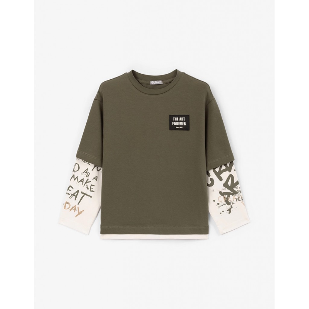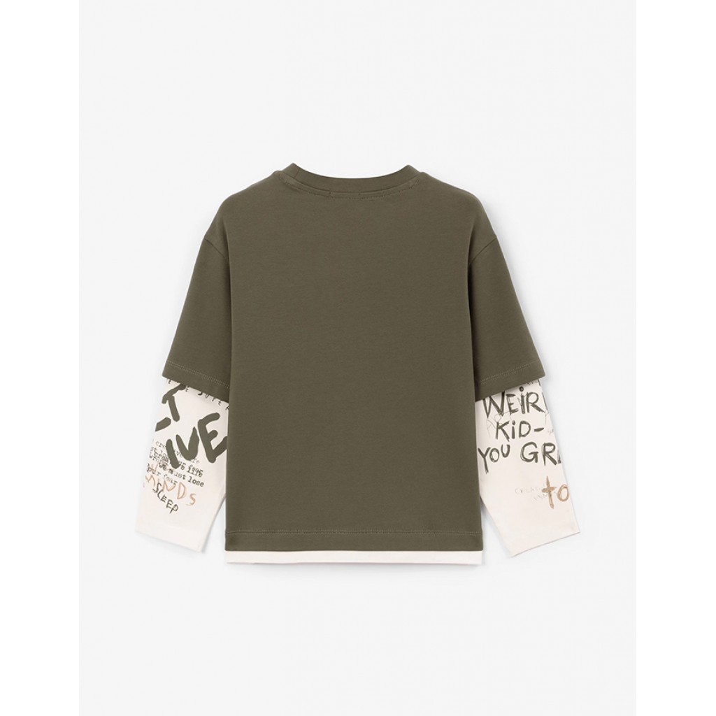 Лонгслив цвета хаки прямой свободной формы – универсальная базовая вещь осенне-зимнего гардероба мальчика. Лонгслив выполнен из мягкого хлопкового полотна с эластаном, очень приятного при тактильном контакте. Дизайн модели построен на многослойности, имитирующей комплект: лонгслив с принтом и однотонную футболку с коротким рукавом. Она придает изделию небрежность и непринужденность стритстайла - главного тренда современной моды. В оформлении модели использована кожаная нашивка.