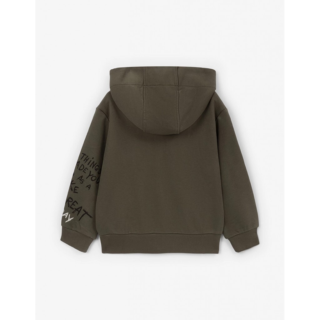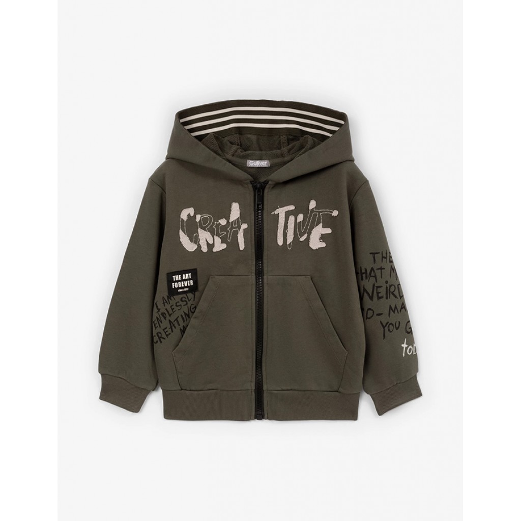 Распашная толстовка брутального цвета хаки станет частью самых комфортных образов мальчика! И как верхний слой аутфитов ранней осенью, и под куртку или пальто зимой, толстовка из хлопкового футера с мягкой петельчатой изнанкой будет незаменима. Дизайн модели отсылает к модному стилю гранж: крупный шрифтовой декор в технике аппликации с открытыми срезами, текстовые принты, нанесенные от руки размашисто и небрежно, придают толстовке дерзость и непринужденность стритстайла - главного тренда современной моды. Толстовка имеет накладные карманы со скосом, подобные кенгуру, застегивается на тракторную молнию.