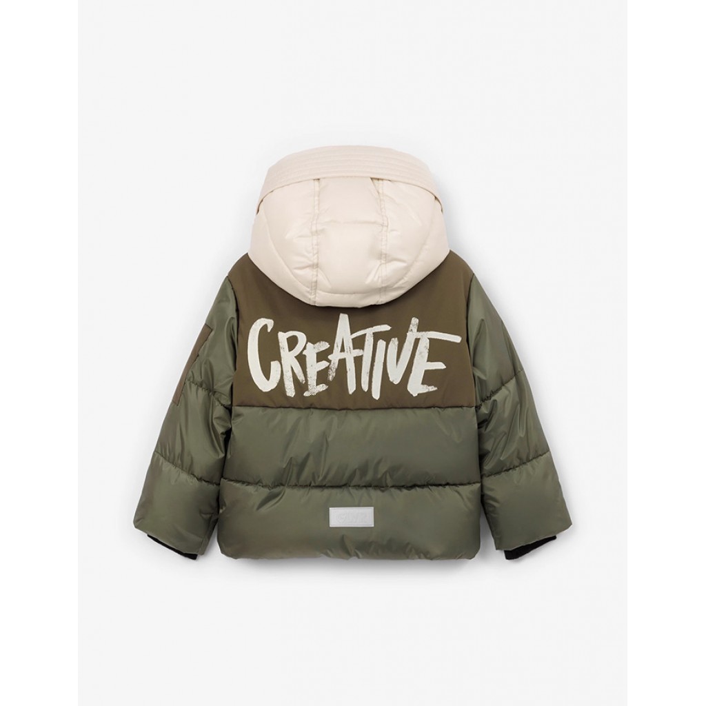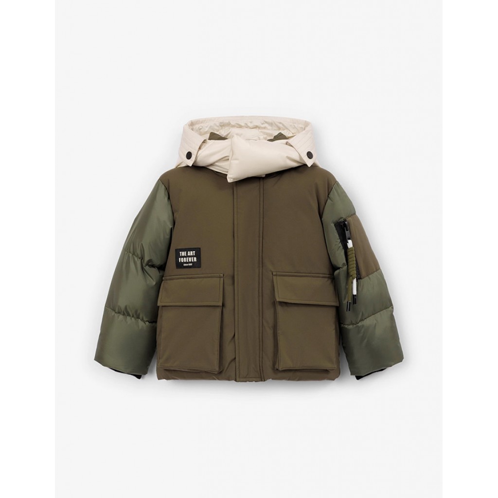 Стеганая зимняя куртка в брутальном цвете хаки — прекрасный выбор для прогулок в холодную ненастную погоду! Дизайн модели построен на сочетании фактур матовой плащовки на передней части и спинке и стеганой глянцевой плащовки на рукавах. Контрастный капюшон с козырьком, застегивающийся на велкро, добавляет куртке цветовой акцент. Утеплитель - искусственный пух, влагостойкие немаркие материалы верха, уютная флисовая подкладка, мягкие трикотажные манжеты делают куртку теплой, практичной, износостойкой, отлично подходящей для долгих и продолжительных зимних прогулок. Кроме того, куртка имеет целый ряд интересных и удобных функциональных деталей - ярких примет стиля кэжуал. Объемные накладные карманы с клапанами, карман на рукаве с застежкой на молнию с крупным акцентным пуллером-шнурком, внутренние лямки, позволяющие в помещении носить куртку за спинкой как рюкзак, придают ей острый, модный, современный вид, создают удобство в эксплуатации вещи. Куртка застегивается на тракторную молнию с ветрозащитной планкой на скрытых кнопках. В оформлении модели использована жаккардовая нашивка с шрифтовыми элементами, крупный контрастный принт на спинке и светоотражающий шеврон, способствующий безопасности мальчика в темное время суток.
