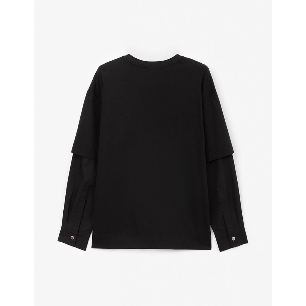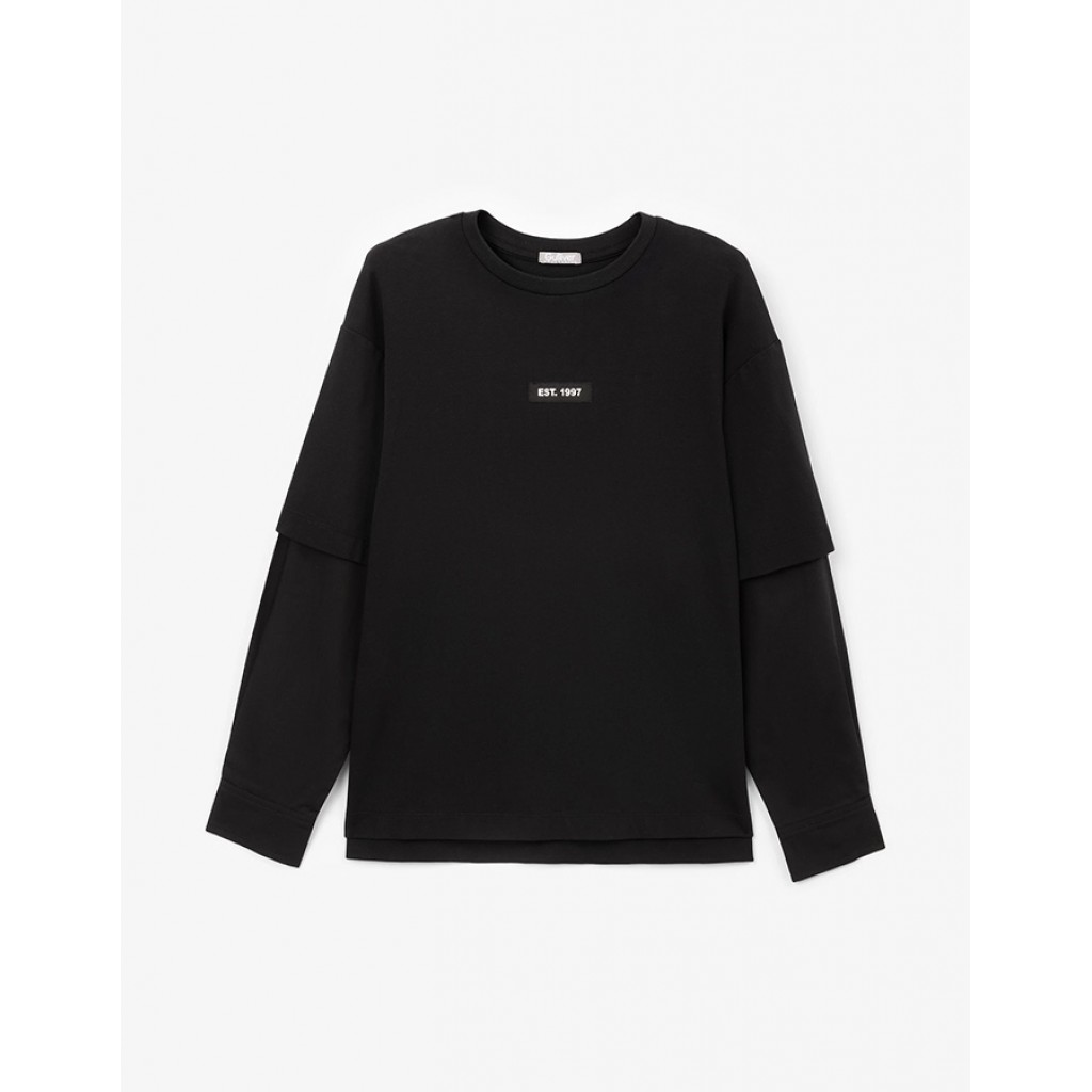 Черный лонгслив прямой свободной формы – лаконичная базовая вещь, способная сделать осенне-зимний гардероб подростка стильным, практичным, функциональным. Лонгслив выполнен из мягкого хлопкового полотна с эластаном, очень приятного при тактильном контакте. Дизайн модели построен на имитации многослойности. В оформлении лонгслива использована минималистичная нашивка.