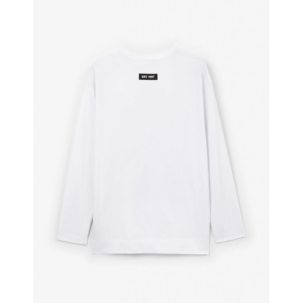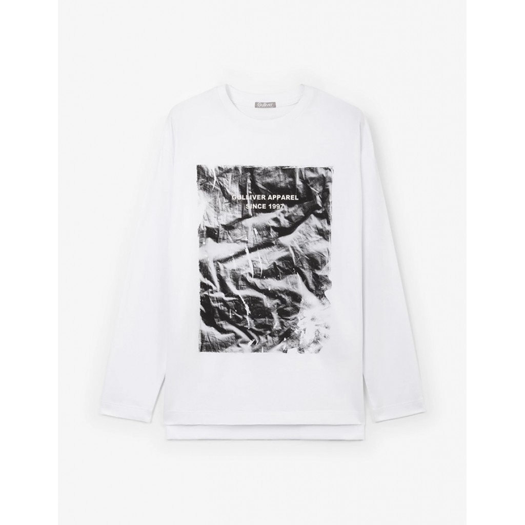 Белый лонгслив прямой свободной формы с крупным принтом – основа стильного гардероба подростка для свободного времени. Благодаря черно-белому абстрактному изображению, лонгслив выглядит остро и интересно, прекрасно сочетаясь с любыми брюками, джинсами, джоггерами. Модная форма со спущенной линией плеч и заниженной линией спинки, лаконичный дизайн делают его универсальным, подходящим для формирования любых многослойных комплектов в духе времени. Лонгслив выполнен из мягкого хлопкового полотна с эластаном, очень приятного при тактильном контакте.
