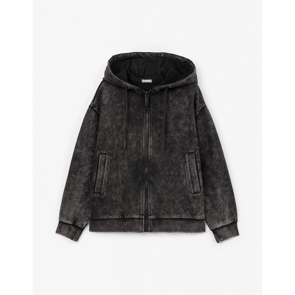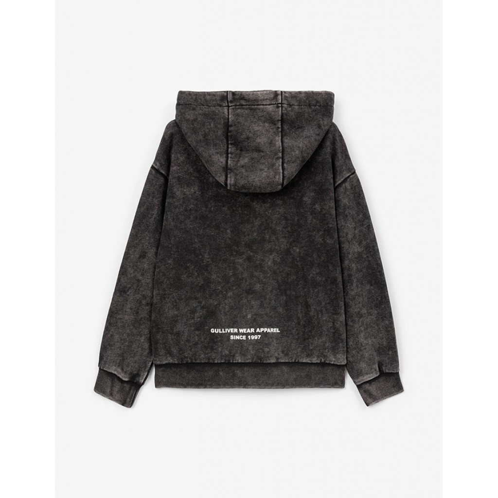 Распашная толстовка с капюшоном из вареного футера сделает осенне-зимний гардероб мальчика модным, практичным, функциональным! Очень мягкая, комфортная, с потертостями и непрокрасом, толстовка подчеркивает гранжевую стилистику в дизайне модели, придавая любым комплектам с ней стильный, дерзкий, брутальный вид. Толстовка застегивается на тракторную молнию, имеет удобные карманы-листочки. В оформлении модели использованы небольшие шрифтовые принты.