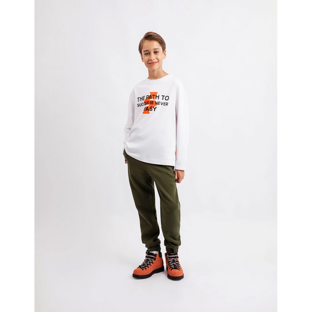 Брюки-джоггеры из футера с уютным начесом - обязательный атрибут осенне-зимнего гардероба активного мальчика. Брюки имеют пояс на резинке с кордами и прорезными карманами в боковых швах с застежкой на молнии. В оформлении модели использован фактурный контрастный шрифтовой принт.