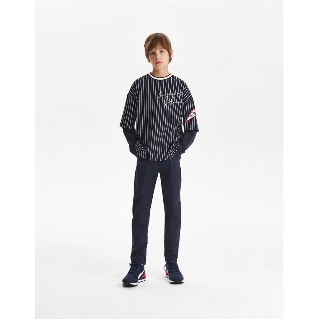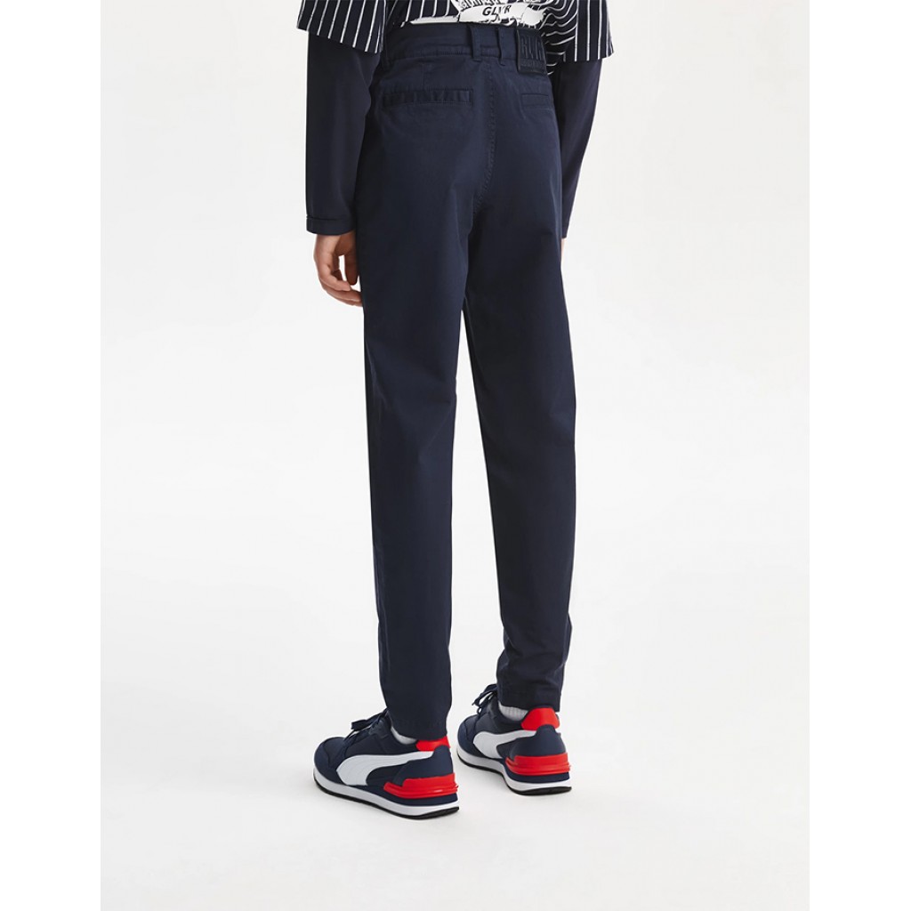 Синие зауженные к низу брюки средней посадки - лучший выбор для осенних образов мальчика в стиле смарт кэжуал! Брюки-чиносы выполнены из плотного формоустойчивого твила с доминирующим содержанием хлопка. Брюки имеют два боковых кармана со скосом, два задних кармана-листочки, шлёвки для ремня. Брюки застегиваются на молнию и пуговицу.