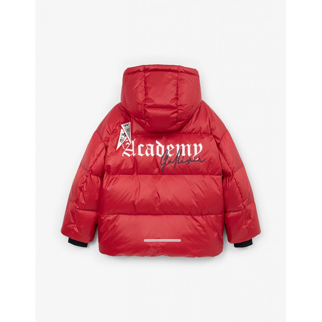 Стеганая красная куртка на натуральном пуху проявит себя с лучшей стороны в суровых зимних условиях! Выполненная из блестящей влагостойкой плащовки на мягкой плащевой подкладке, куртка обладает эстетичностью, аристократичностью, особым шиком легкой пуховой зимней вещи, вдохновленной эстетикой стиля Преппи(Preppy). Дизайн модели построен на колорблокинге и ярких элементах оформления, способных придать образу мальчика динамику и остроту. Благодаря цветовому контрасту основного материала и подкладки, трикотажных манжет, тракторных молний на карманах и центральной застежке, поддержанных шрифтовыми принтами, эмблемой, нашивками, куртка имеет премиальный вид, выглядит модно, интересно, отражая самые актуальные тренды. Кроме того, куртка имеет внутренние утяжки по капюшону и низу изделия, создающие дополнительные возможности в ненастный день. Куртка застегивается на тракторную молнию на контрастной цветной тесьме с оригинальным пуллером. В оформлении модели использован светоотражающий принт, способствующий безопасности мальчика в тёмное время суток.