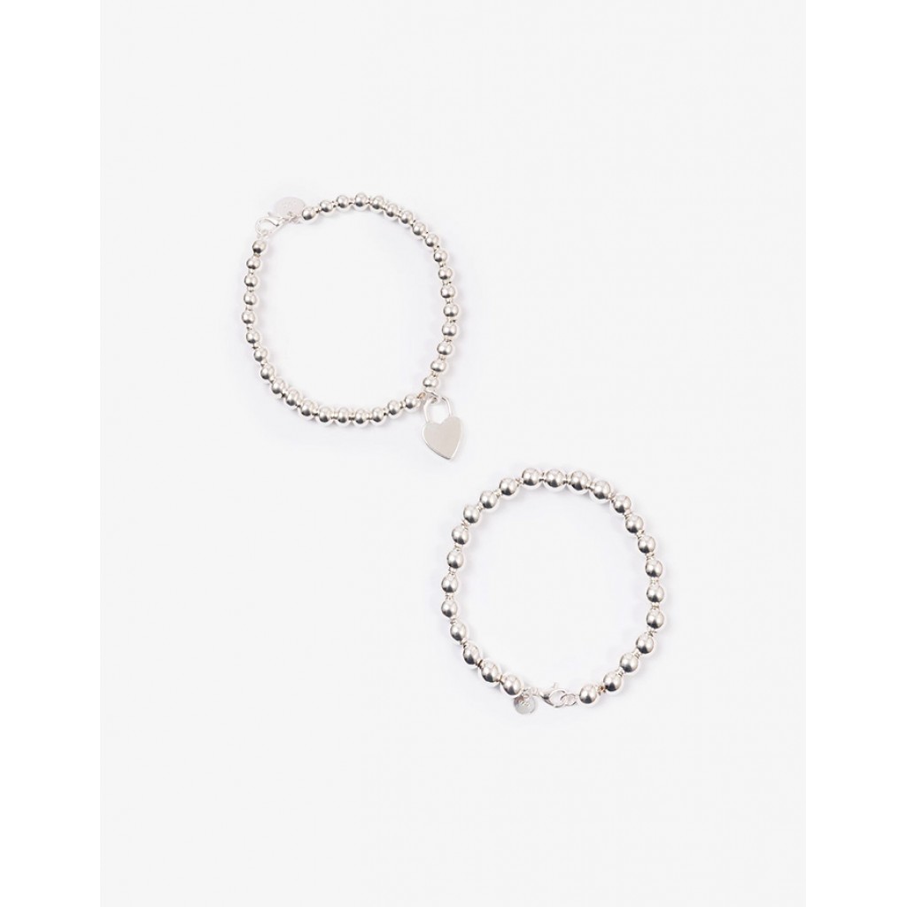 Набор из 2-х серебристых браслетов с декором из металлических бус и подвески-сердца украсит как повседневный, так и нарядный праздничный образ девочки. Браслеты застегиваются на цепочки с карабинами.