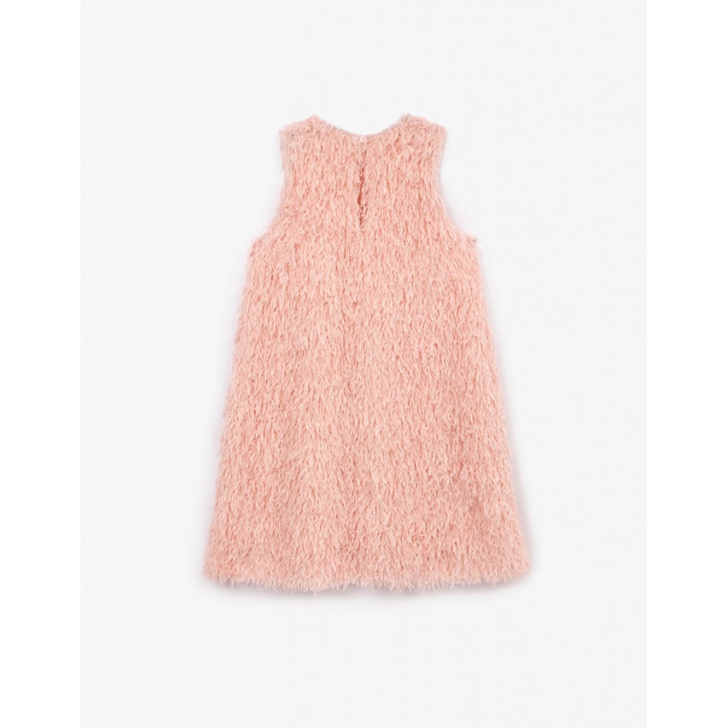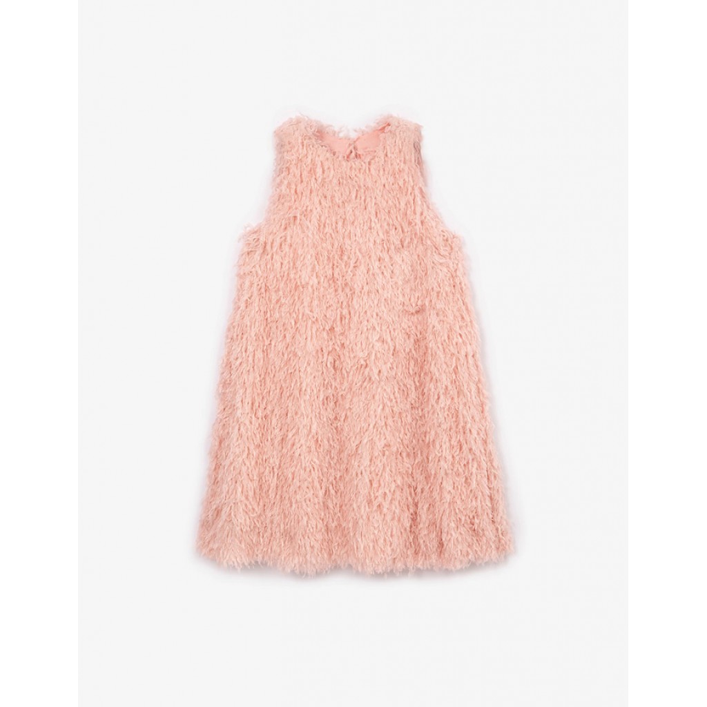 Воздушное и невероятно тактильное платье без рукавов розового цвета создано для самых ярких моментов детства. Платье на хлопковой подкладке выполнено из материала с уникальной фактурой: ткань покрыта сотнями нитей в виде перышек, которые танцуют, переливаются, играют светом при движении. Платье комфортного трапециевидного силуэта имеет застежку-капельку на спинке, фиксирующуюся на пуговицу.