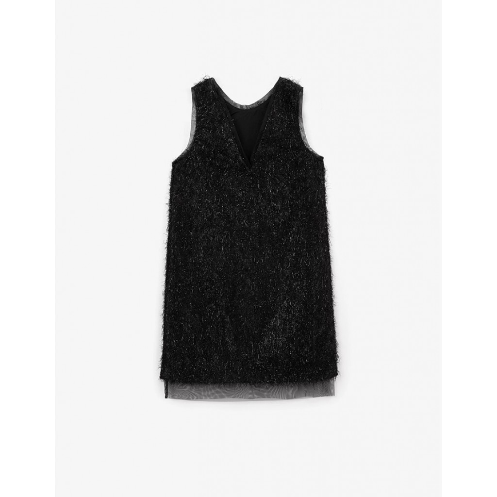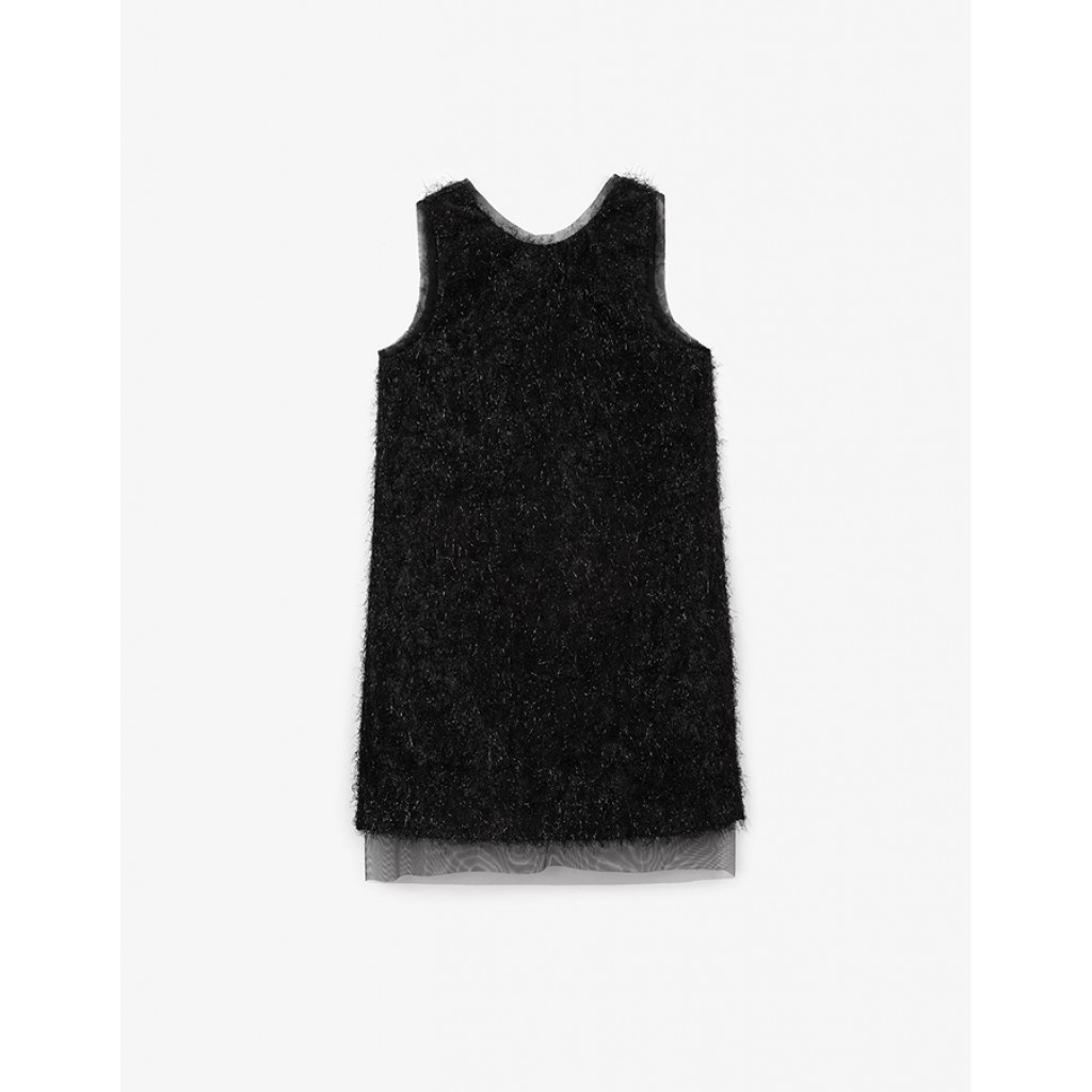 Черное платье трапециевидной формы – яркое оригинальное решение для особых событий в жизни девочки. Завораживающая фишка лаконичного черного платья с V-образным вырезом на спинке - уникальная фактура! Ворсистая, объемная, с добавлением сияющих люрексовых нитей, она создает потрясающий эффект ночного неба. Хлопковая подкладка обеспечивает приятное прилегание к телу.
